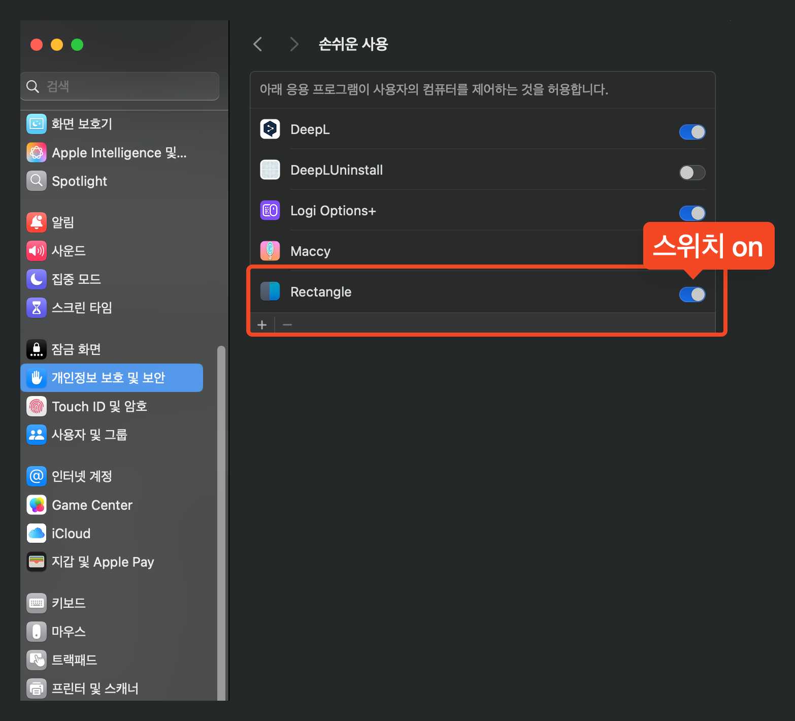 Rectangle은 창을 제어해야 하므로 '손쉬운 사용' 권한이 필요합니다.