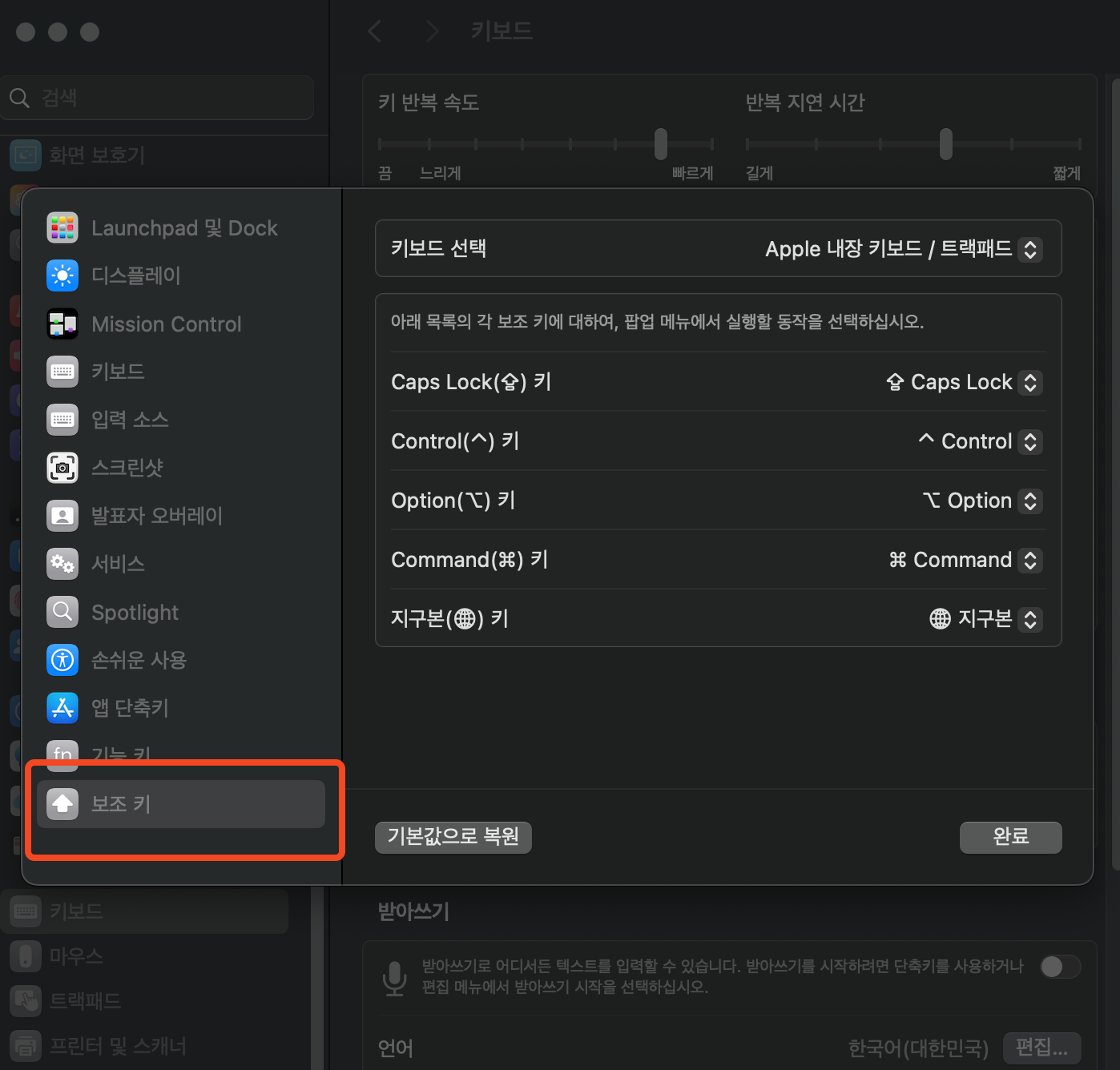 설정 경로: 시스템 설정 → 키보드 → 키보드 단축키 → 보조 키 → 원하는 키 변경