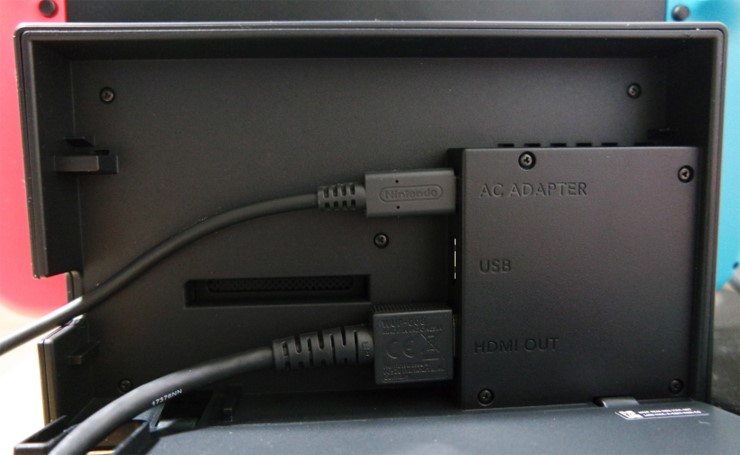 위 사진은 독 뒤편입니다. 위쪽 선은 어댑터 선이면 아래는 HDMI선입니다. 연결해 준뒤에 스위치 본체를 독에 꽂으면 됩니다.