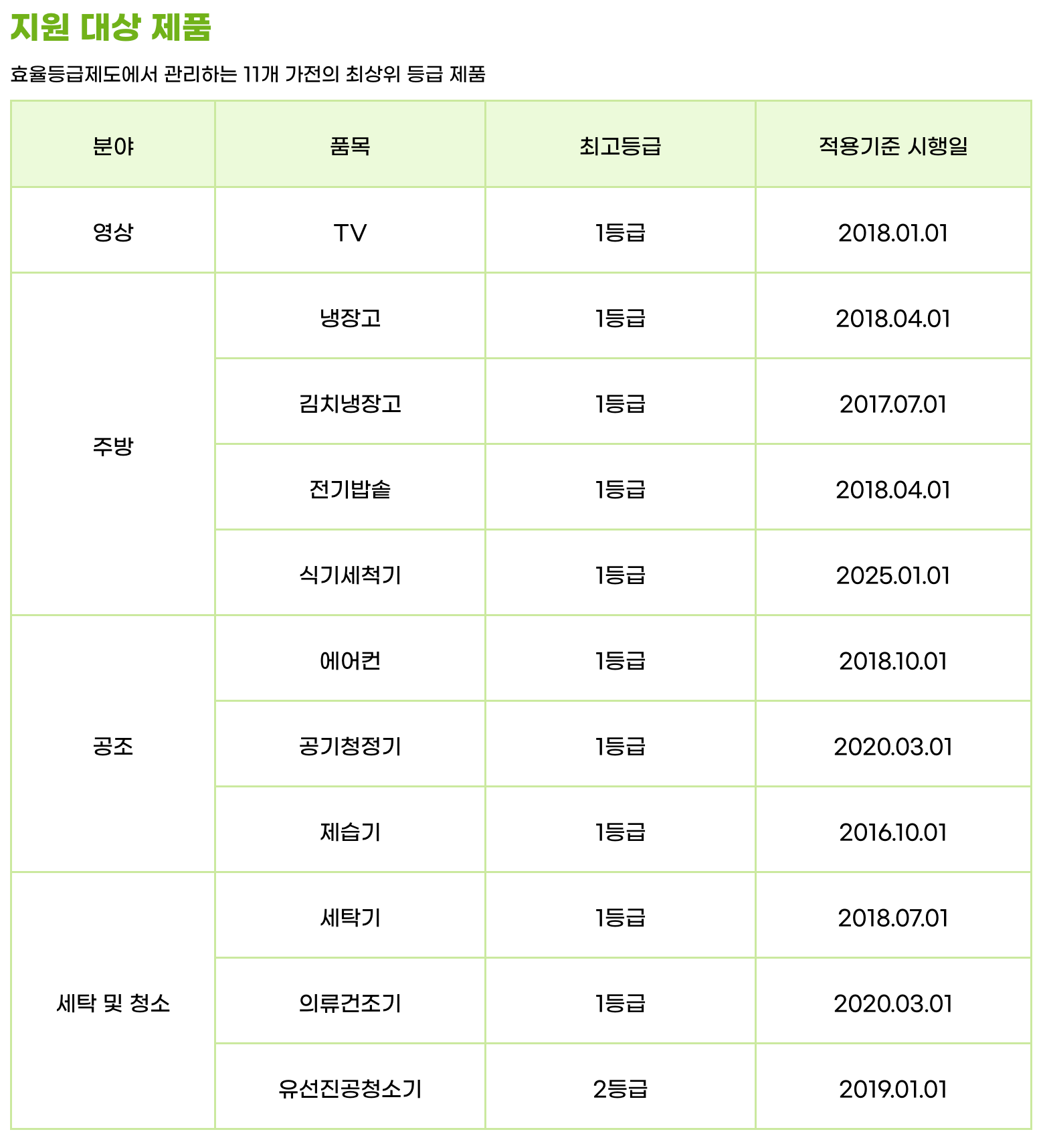 - 에너지 소비효율 등급: 구매한 제품이 에너지 소비효율 1등급 제품이어야 합니다. (일부 품목은 2~3등급도 포함되니 공식 홈페이지에서 모델명 검색 필수!)