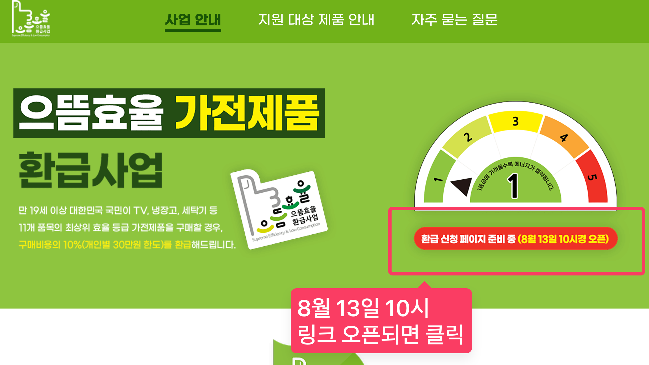 드디어 많은 분이 기다리시던 '2025년 으뜸효율 가전제품 환급 사업'이 코앞으로 다가왔습니다. 에너지 소비효율이 높은 가전제품을 구매하신 분들께 구매 비용의 일부를 돌려주는 정말 꿀 같은 정책인데요, 올해는 8월 13일부터 신청이 시작됩니다.
