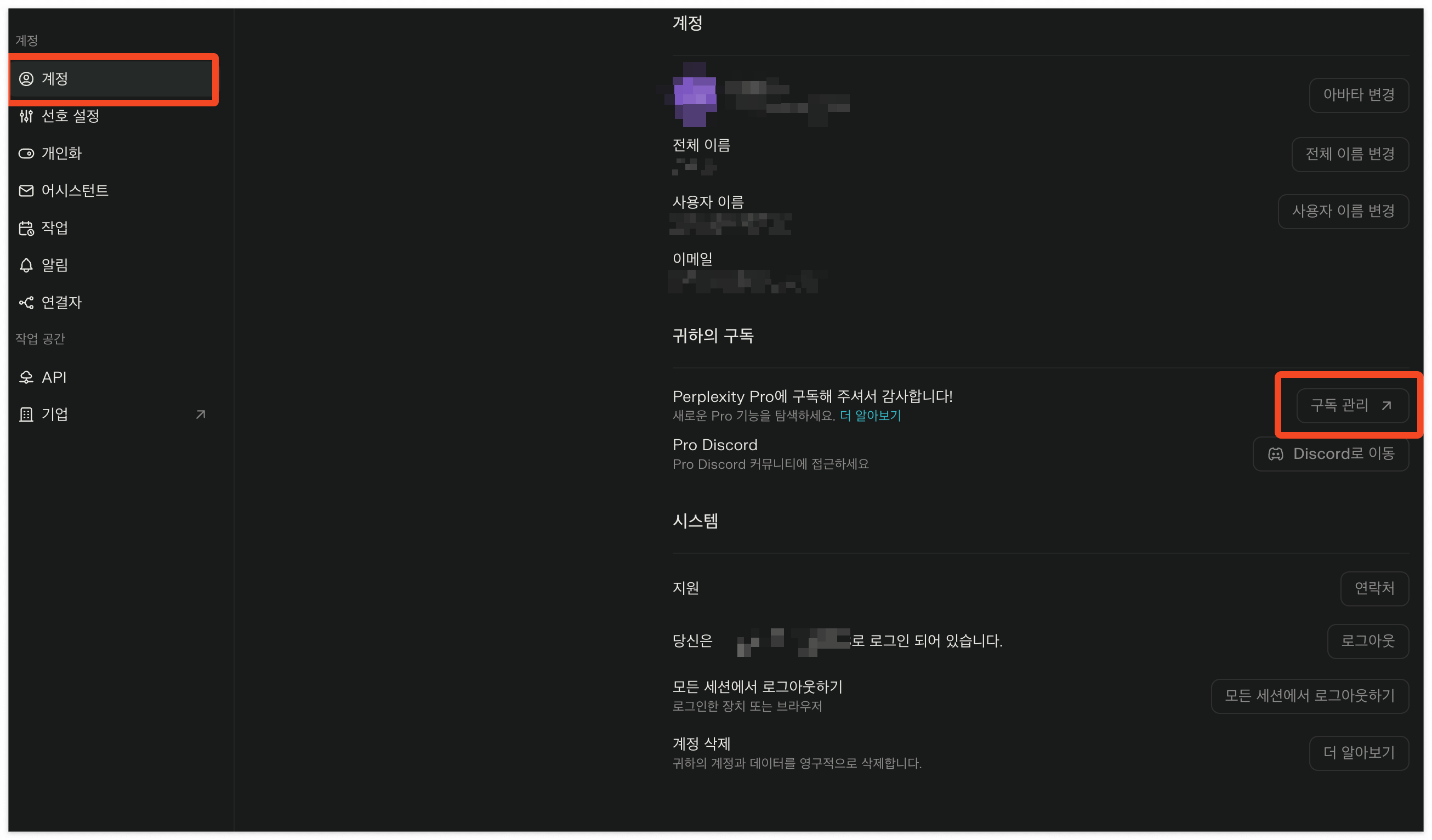 - 퍼플렉시티 화면 왼쪽 상단 [계정 아이콘] 클릭
