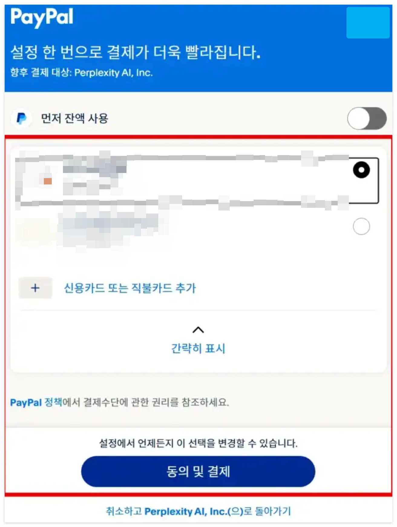 페이팔에 등록된 카드를 확인하고 [동의 및 결제]를 클릭합니다. 마지막으로 퍼플렉시티 화면에서 [제안 수락(Accept Offer)] 버튼을 누르면 완료!