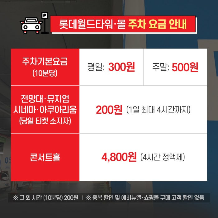 - 백화점 구매: 롯데백화점 영수증(3만 원 이상 1시간, 5만 원 이상 2시간)으로 할인 가능.