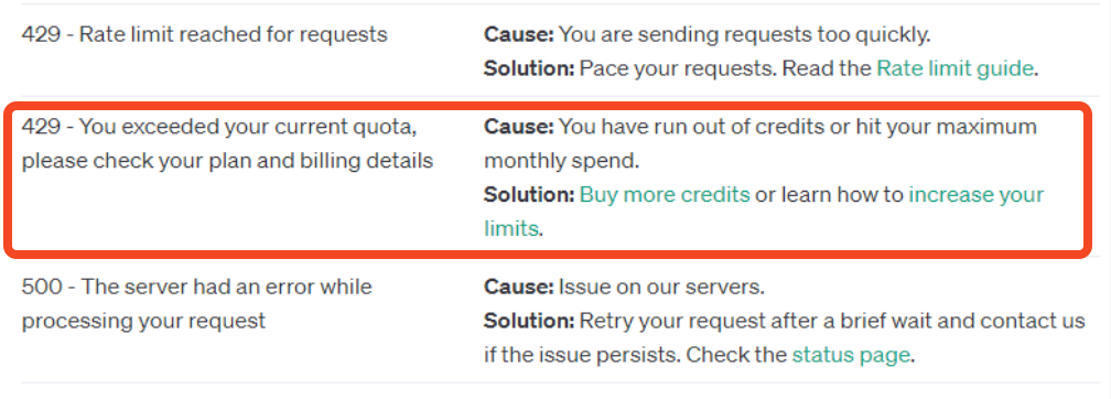 | 해결책 | 요청 속도 조절 (천천히 재시도) | 지갑을 여세요... 💳 (크레딧 충전) |