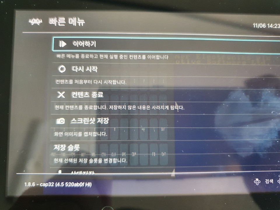 7) 게임이 실행되면 조이콘 +,- 버튼을 동시에 눌러 위와 같은 메뉴 화면이 나옵니다.