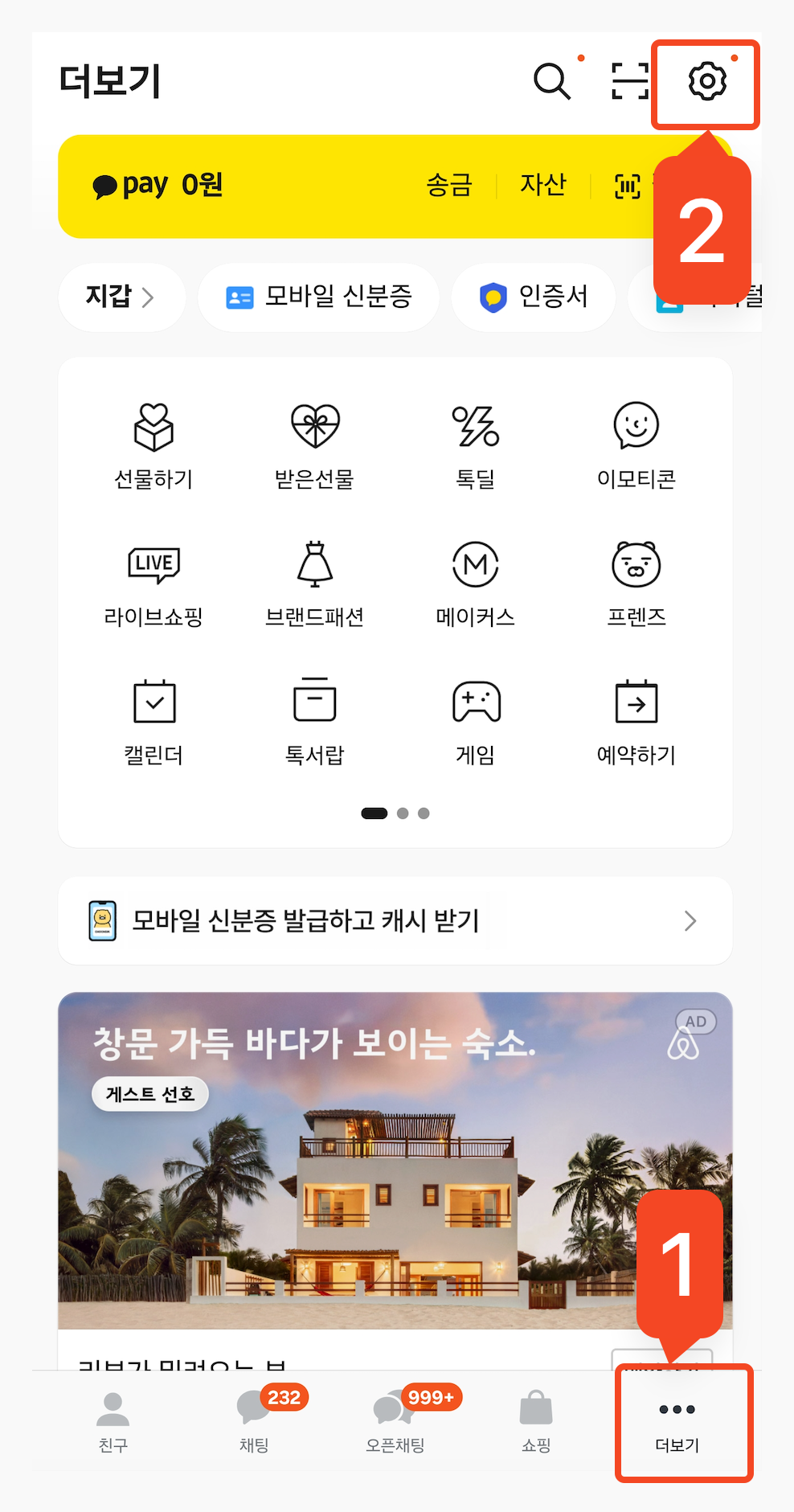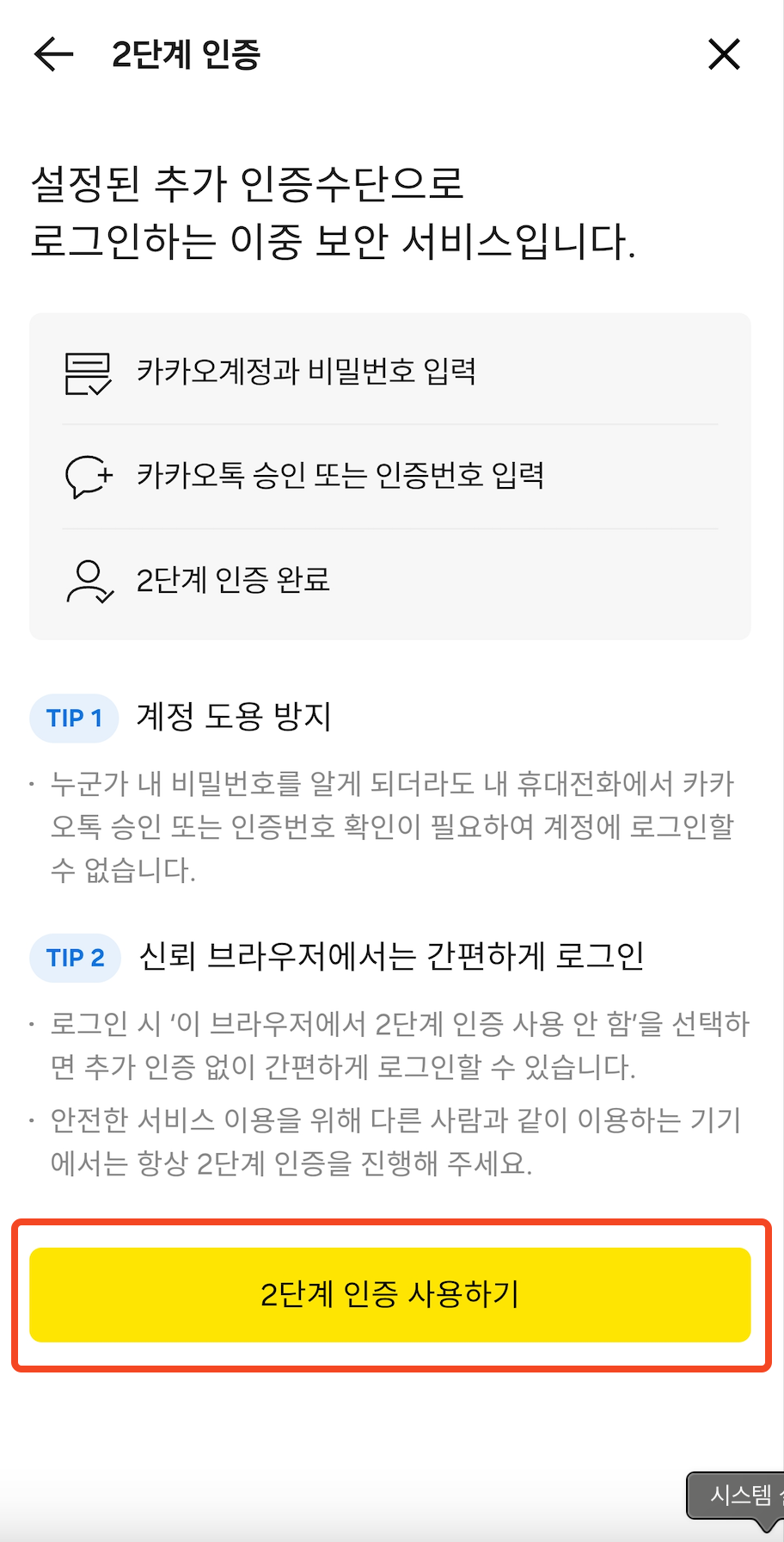 - 카카오: 톱니바퀴 → 카카오계정(이메일) → 계정보안 - 2단계 인증 → 2단계 인증 사용하기
