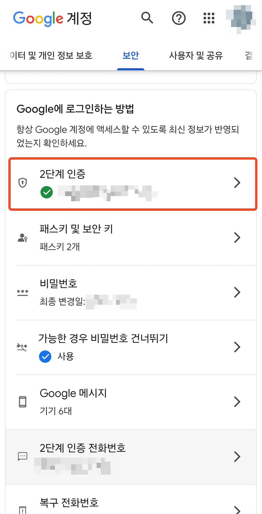 - 구글: 구글 접속 → 프로필 클릭 → google 계정 관리 → 보안 탭 - 2단계 인증