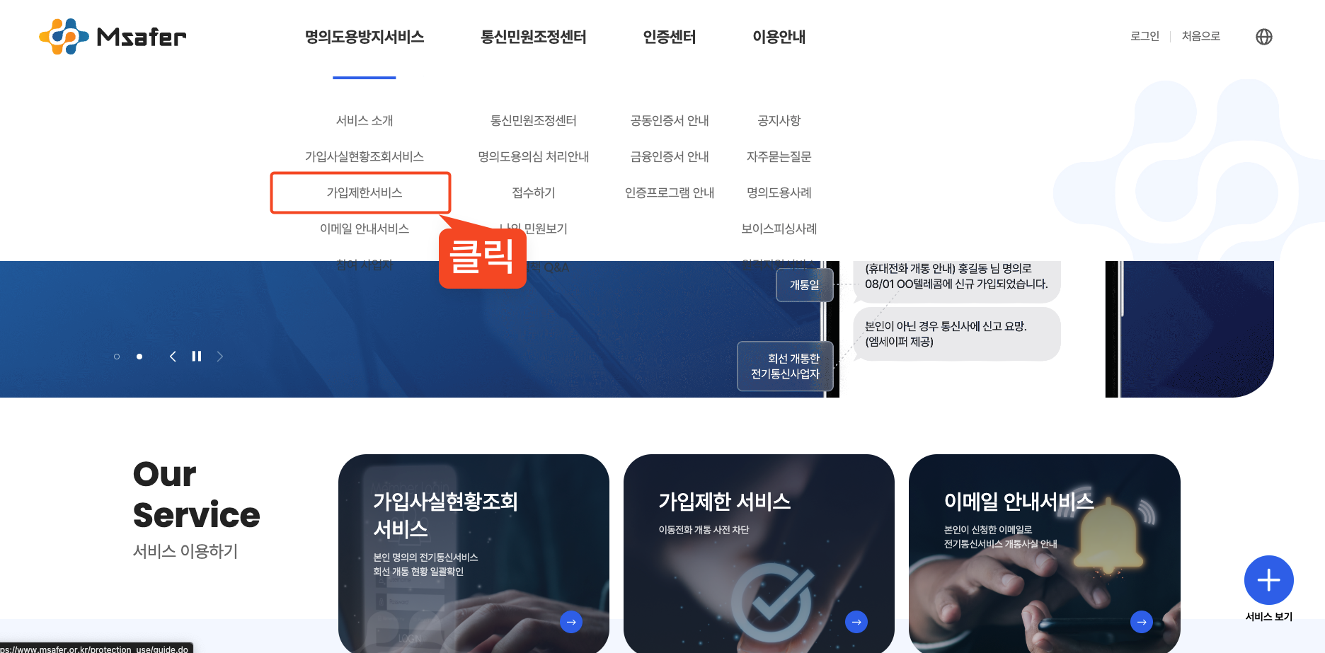 2. '가입사실현황조회 서비스' 또는 '가입제한 서비스' 메뉴를 클릭합니다.
