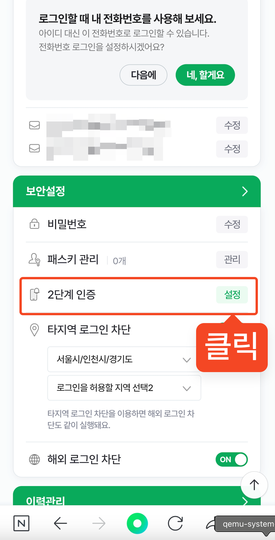 - 네이버: 메뉴 버튼 → 톱니바퀴 버튼 → 내 정보 보안기능 → 2단계 인증