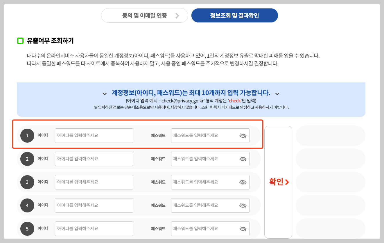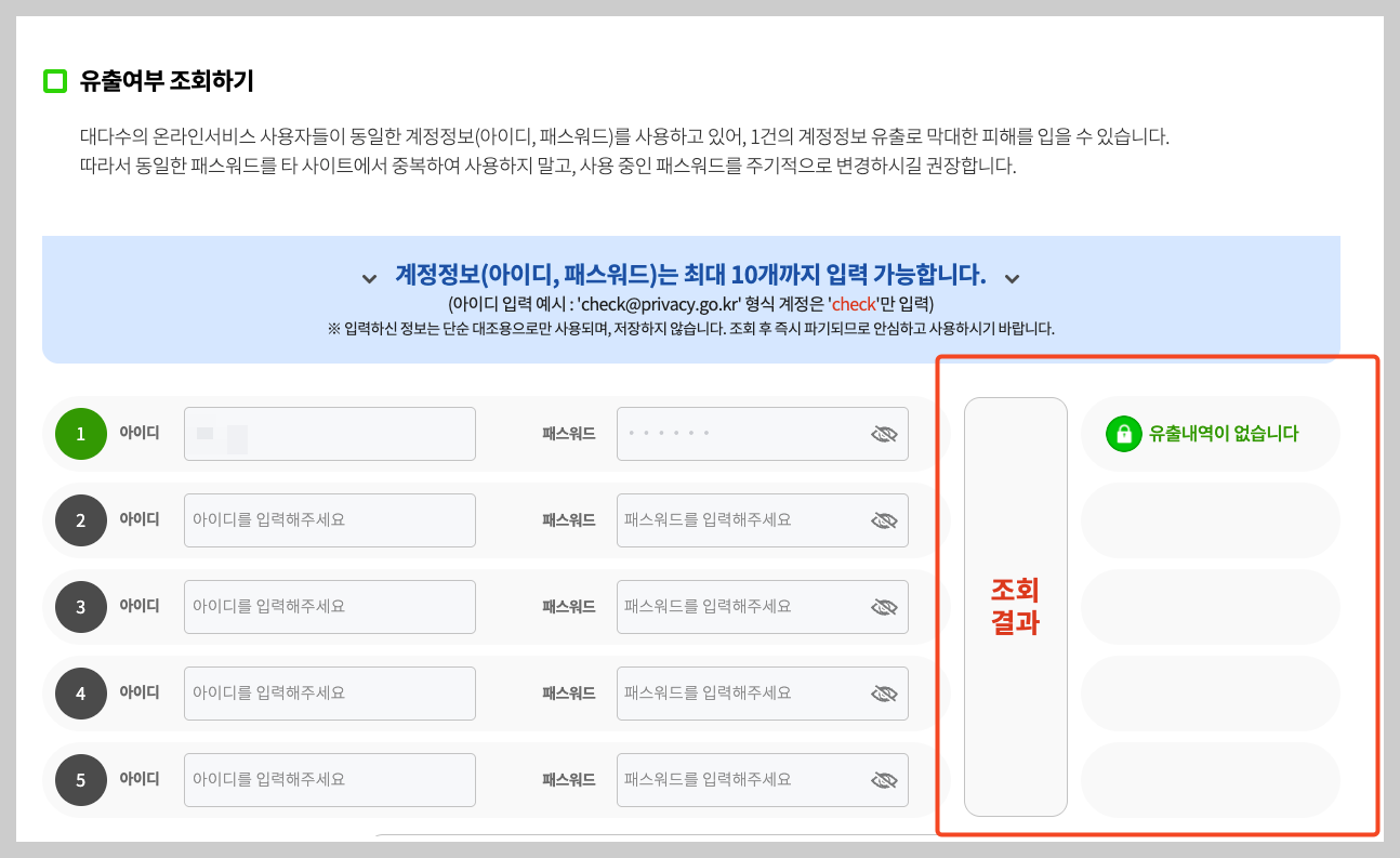 3. 조회할 계정 정보 입력: 내가 자주 사용하는 아이디와 비밀번호 조합을 최대 5개까지 입력합니다. 입력된 정보는 암호화되어 조회에만 사용되고 즉시 파기되니 안심하세요.