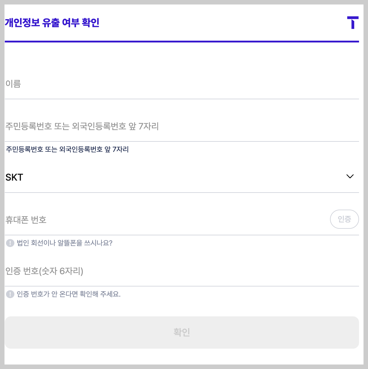 3. '개인정보 유출 여부 조회' 메뉴 접속: https://m.tworld.co.kr/v0/infocheck