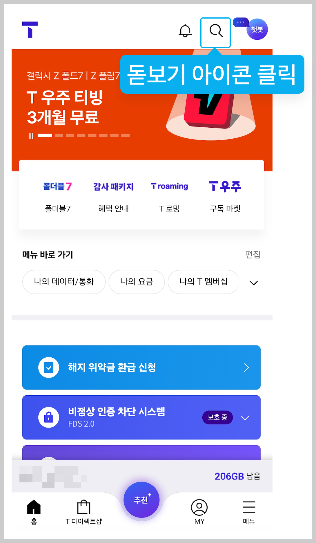 1. 모바일 T월드 앱 실행: 스마트폰에 설치된 'T월드' 앱을 실행하고 로그인합니다.
