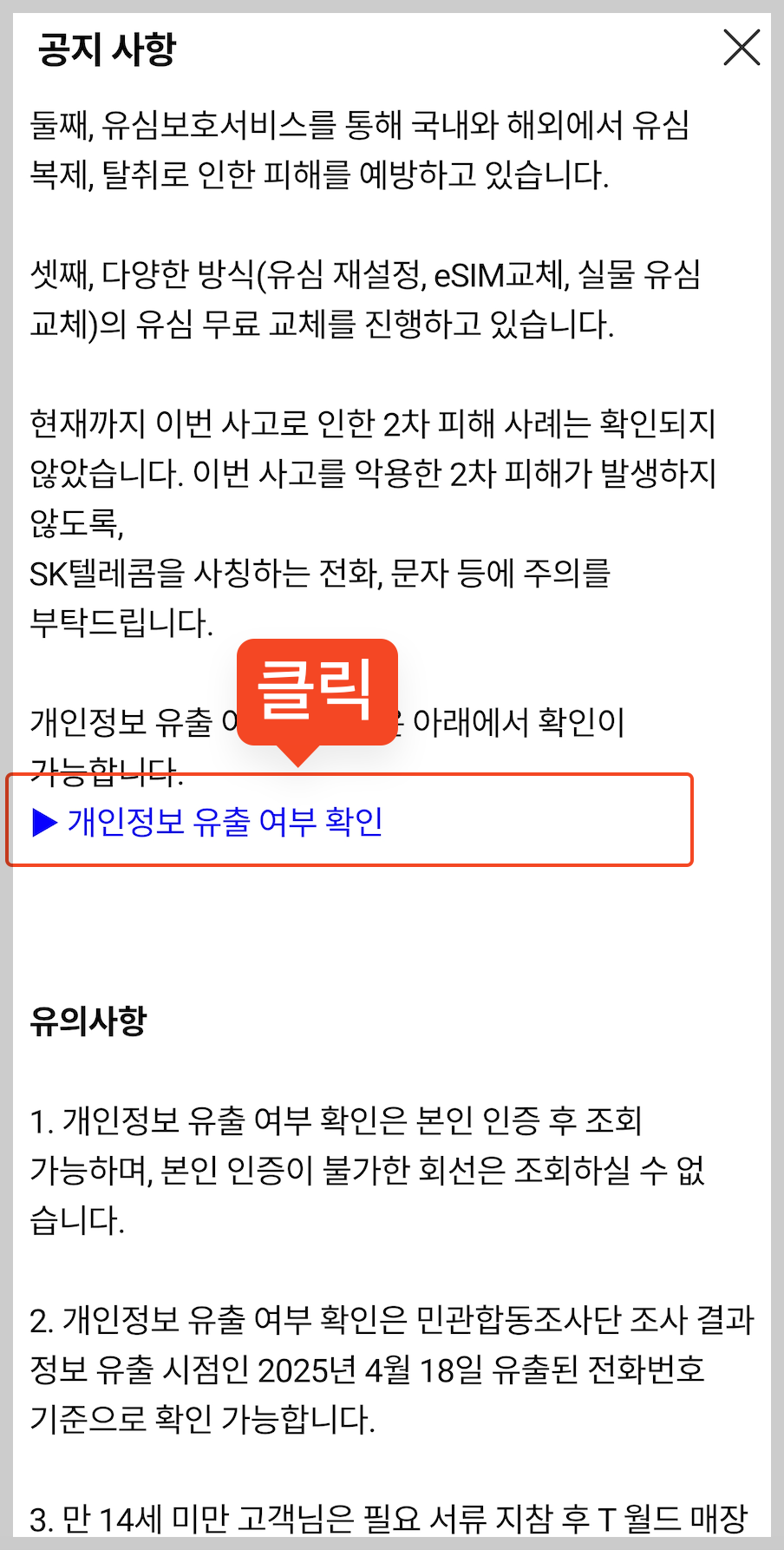 유출 조회를 위한다는 명목으로 가짜 피싱 사이트나 스미싱 문자가 기승을 부릴 수 있습니다. 반드시 SKT 공식 홈페이지(tworld.co.kr)나 공식 앱을 통해서만 확인하세요! 출처가 불분명한 링크는 절대 클릭하지 마세요.